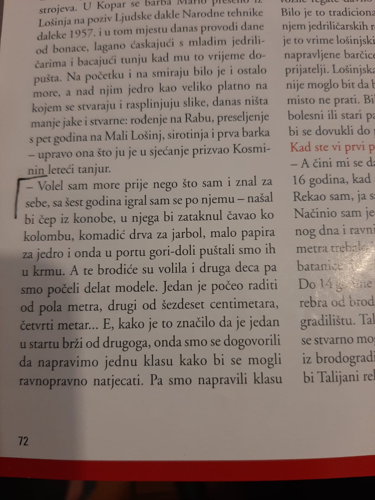"...I loved the sea before I could even understand myself, with 6 years old I would find an old cork bottle cap and then I would insert a nail into it as a keel, a little bit of paper for sails and then we would let them downwind. All the kids loved these small sailboats, so we started working on our models. One was working on a half-meter, another on 60cm and another on one metre...So, because that meant one was faster than another, we all agreed to make one class so that we could all participate in competitions equally. That is why we have built a one-metre class which had 2m masts and 20 cm width. When we reached 18 years old we were building those big models and then we would let them go towards Lošinj port (gate). First, we would release them, and then we would all row behind them, models are racing fast powered by wind, and we are lagging behind them, so when we reach the end we would quickly rotate them with a wooden stick. From that it all started, I started working in the shipyard Martinolić and soon there was no place from the keel up towards mast that I was not familiar with."